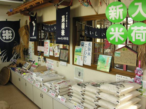 「五ツ星お米マイスター」の竹ノ内義一氏が、契約農家が丹誠込めて育てたおいしいお米を厳選して販売しています。9月には「長狭米」をはじめ、「ふさおとめ」「粒すけ」など多くの銘柄の新米が店頭に並びます。当館 鴨川館で提供している長狭米も竹ノ内米店さんから仕入れています。