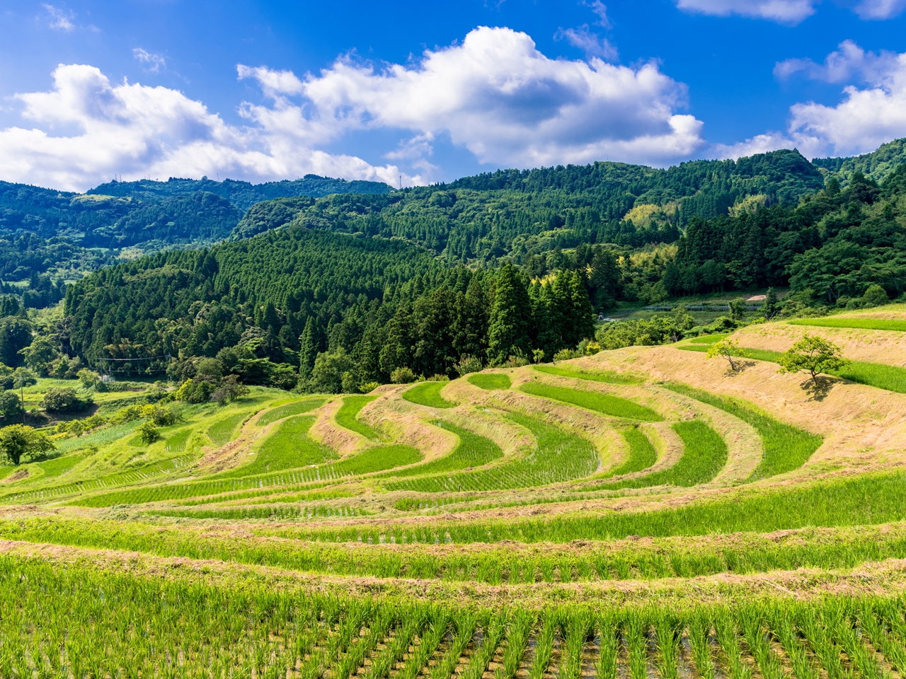 四季折々の風景に出会え、春の田植え前には、棚田の水面に空や周囲の木々を反射しまるで大きな鏡のように。夏は生き生きとした新緑が輝き、秋には稲穂が風に揺れる黄金色の景色が広がります。冬には雪景色を望めることもあり、年間を通して様々な表情で訪れる人々を楽しませています。
