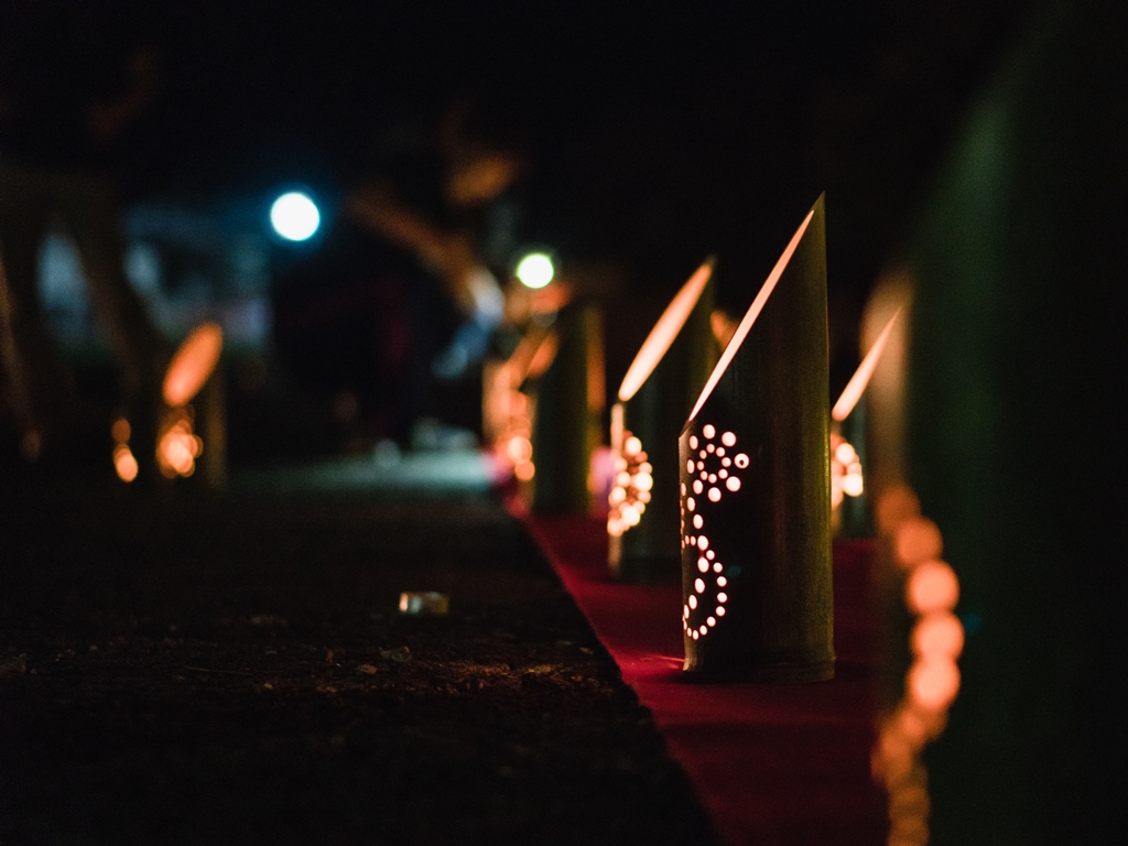 高家神社(たかべじんじゃ)の「竹あかり」。日本で唯一・料理の神様を祀る神社「高家神社」は、当館からお車で40分程。100本の竹灯籠や鳥居を模した大型オブジェなど、数々の光が夜を幻想的に演出。竹灯籠は、南房総市立南房総中学校の3年生70名が製作に取り組まれており、地元の学生の方々の心がこもった灯りをぜひご覧くださいませ。(※写真はイメージです)
