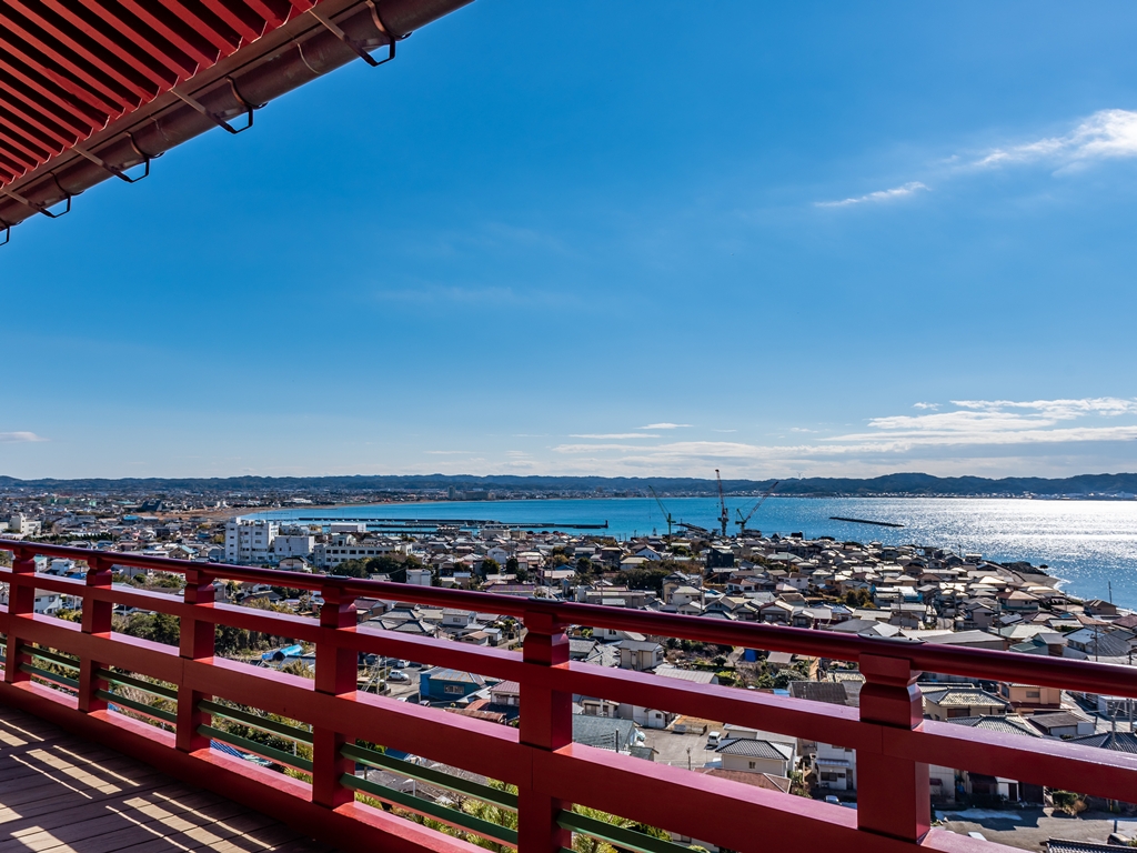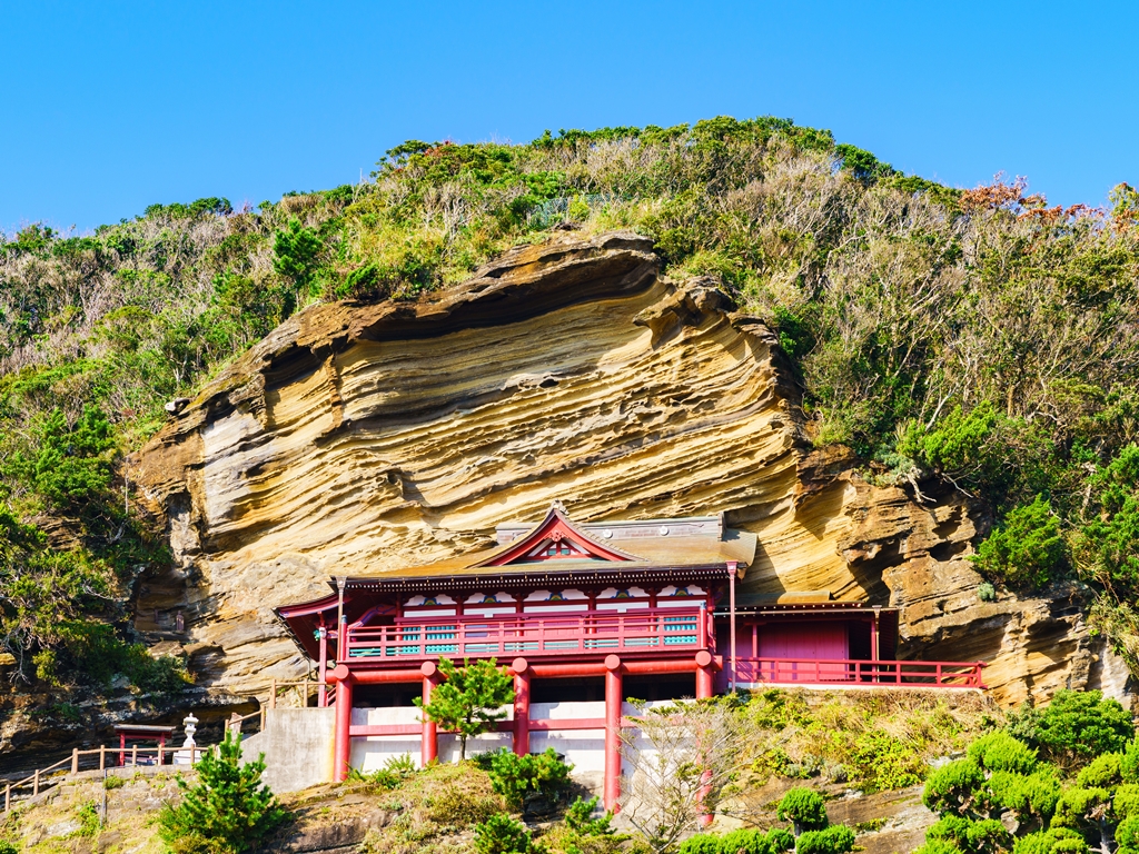 千葉県館山市の船形山中腹に朱塗りの観音堂が張り付くように建つ真言宗智山派のお寺で、海上安全と豊漁を祈願して建立され、館山湾の絶景が楽しめる人気の観光スポットです。本尊は、717年に行基が刻んだとされる岩肌に彫られた十一面観世音菩薩(磨崖仏)で、市の指定文化財にもなっています。 家内安全・安産・子育て・病気平癒(特に頭痛封じなど)・金運・財福授与・諸願成就など、ご利益は幅広く、湾を望む雄大な景色も相まって多くの方が訪れています。