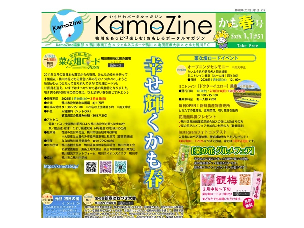 ひと足早く訪れる春の風物詩「菜な畑ロード」や菜の花を使ったグルメが楽しめるスポット・サイクリングエリアなど、年始から春を満喫するイベントをご紹介しています。