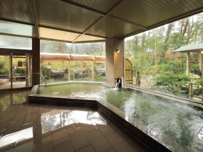 松風を肌に感じながら浸かる露天風呂は、日本庭園と岩に囲まれた野趣あふれる温泉です。