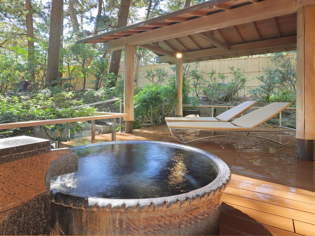 『ときわの湯』は、安房の松原を背景に湯浴みを愉しめる空間。松風を感じながら浸かる露天風呂は、日本庭園と岩に囲まれた野趣あふれる温泉です。