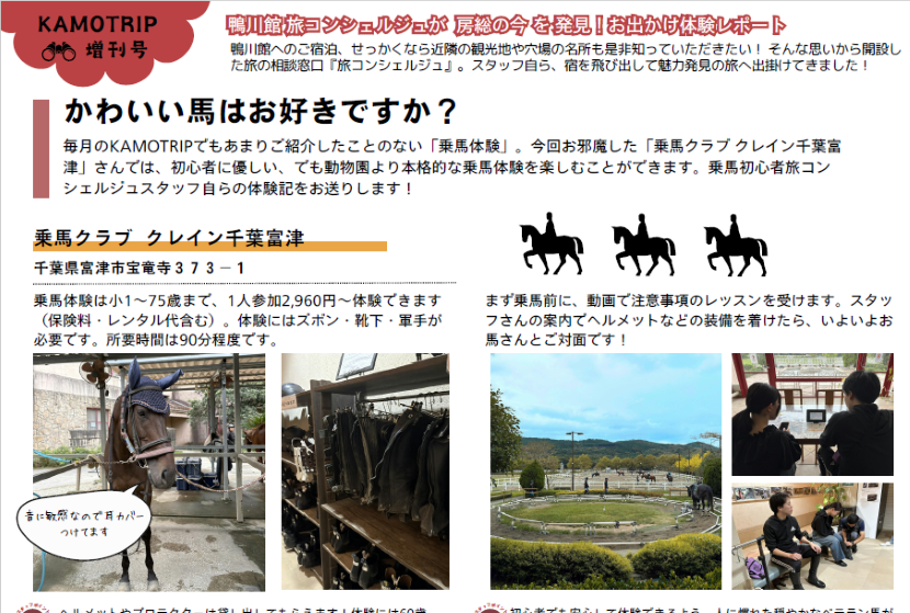 毎月のKAMOTRIPでもあまりご紹介したことのない「乗馬体験」。今回お邪魔した「乗馬クラブ クレイン千葉富津」さんでは、初心者に優しい、でも動物園より本格的な乗馬体験を楽しむことができます。乗馬初心者旅コンシェルジュスタッフ自らの体験記をお送りします!