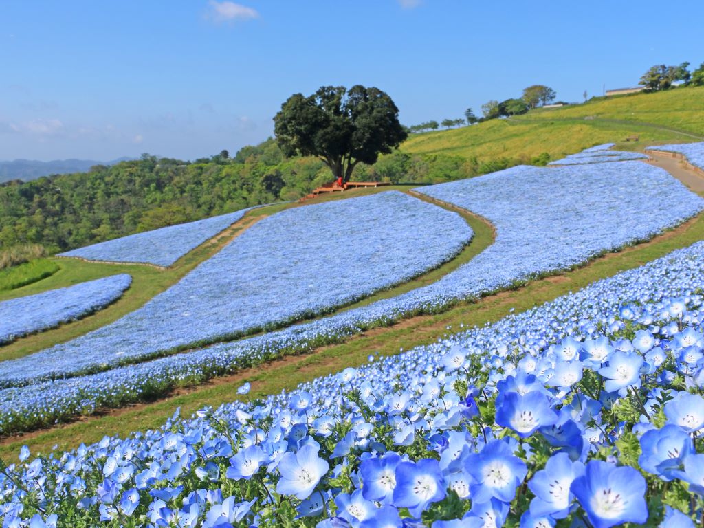房総半島の山々や東京湾、富士山などの雄大な景色が見渡せる鹿野山(かのうざん)にあるマザー牧場。都心から近い場所にありながら、豊かな自然とふれあうことができ、子供から大人まで楽しめる観光牧場として親しまれる、国内有数の施設です。 250ヘクタールという広大な敷地で、豊かな緑、四季の花、愛らしい動物たちとのふれあいを楽しむことができます。現在は、爽やかな水色が一面に広がるネモフィラのシーズン。メインエリアに約100万本ものネモフィラが咲き誇ります。