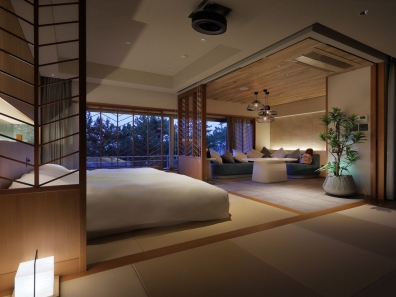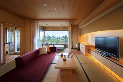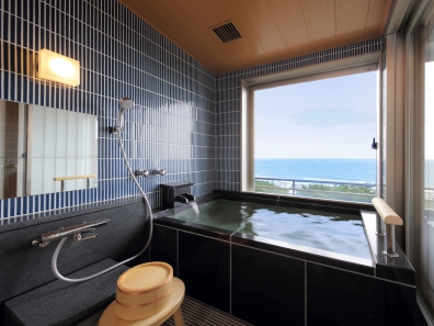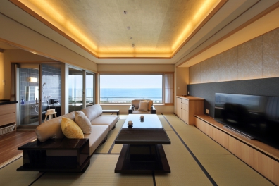 リニューアル客室ではお部屋に温泉を湯引きしており、天候や気候により大きな窓を開閉する事で、より快適に贅沢な湯浴みをお愉しみいただけます。